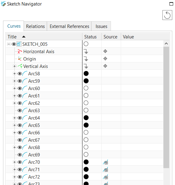 The Sketch Navigator is an excellent tool for viewing sketch geometry, relations and dimensions in a detailed, hierarchical tree. This navigator consists of four primary tabs: Curves, Relations, External References and Issues.
